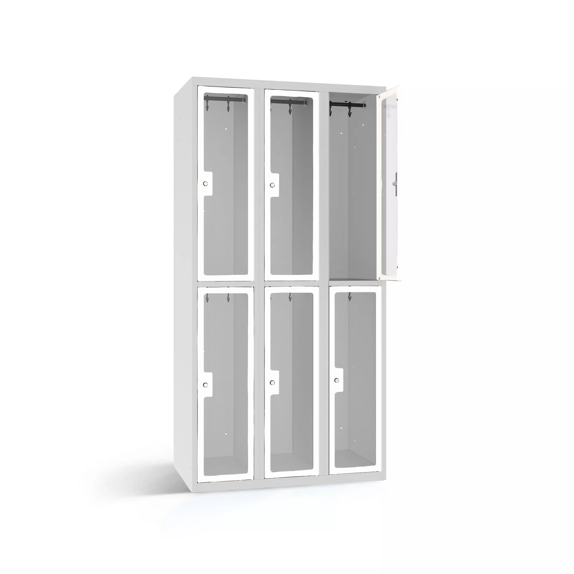 Wenn Sie trotz eines begrenzten Platzangebots möglichst viel Stauraum für die Garderobe Ihrer Kunden oder Mitarbeiter wünschen, dann ist der Garderobenspind für Sie die richtige Wahl. Die zwei übereinander angeordneten Abteile verfügen jeweils über eine robuste Kleiderstange, die mit zwei verschiebbaren Haken versehen ist. Die Abteilböden sind glatt auskehrbar. Für ein besonders hohes Maß an Sicherheit und eine bessere Übersichtlichkeit sind die Spindtüren mit 4 mm starken Plexiglas-Sichtfenstern ausgestattet.